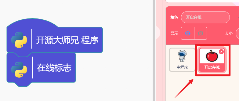 1) 点击苹果(开启在线)角色;上传程序,主控切换至在线运行模式。