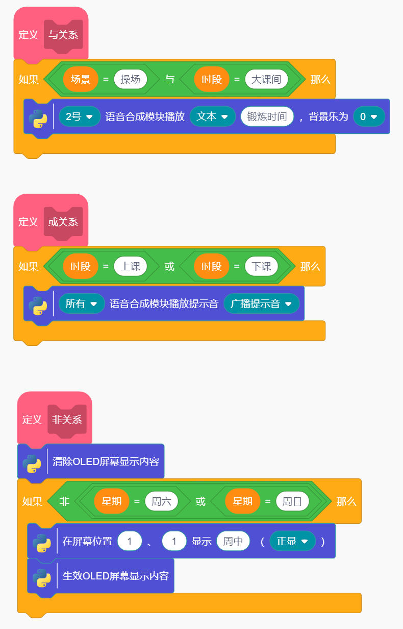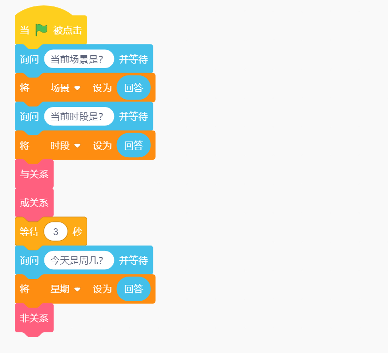 程序分别将三个问题的回答(需在对话框中键盘输入文字)赋值给变量场景、时段和星期,利用与或非三种常见逻辑关系决定提示音的播报方式以及屏幕显示的内容。